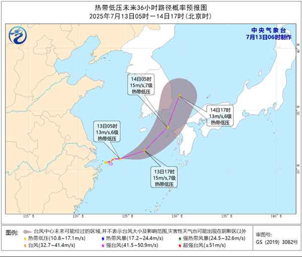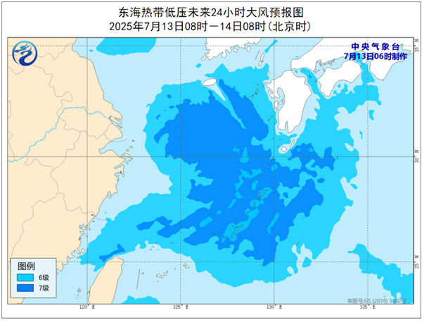 大风预报:7月13日08时至14日08时,东海大部、黄海南部的部分海域将有6~7级大风,阵风可达8~9级。